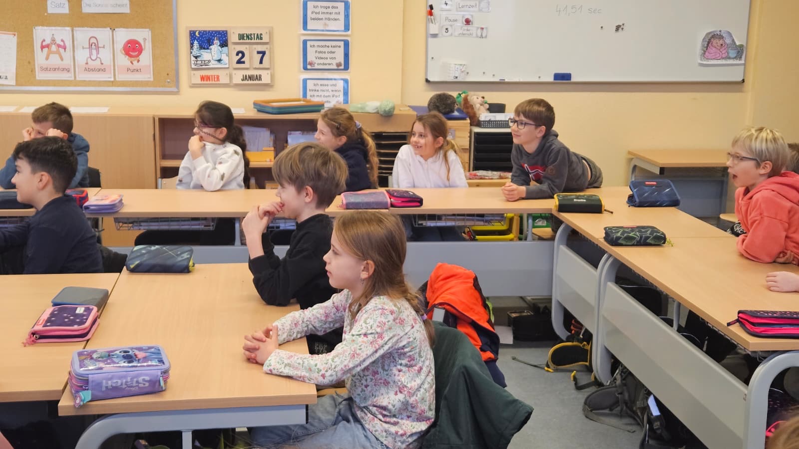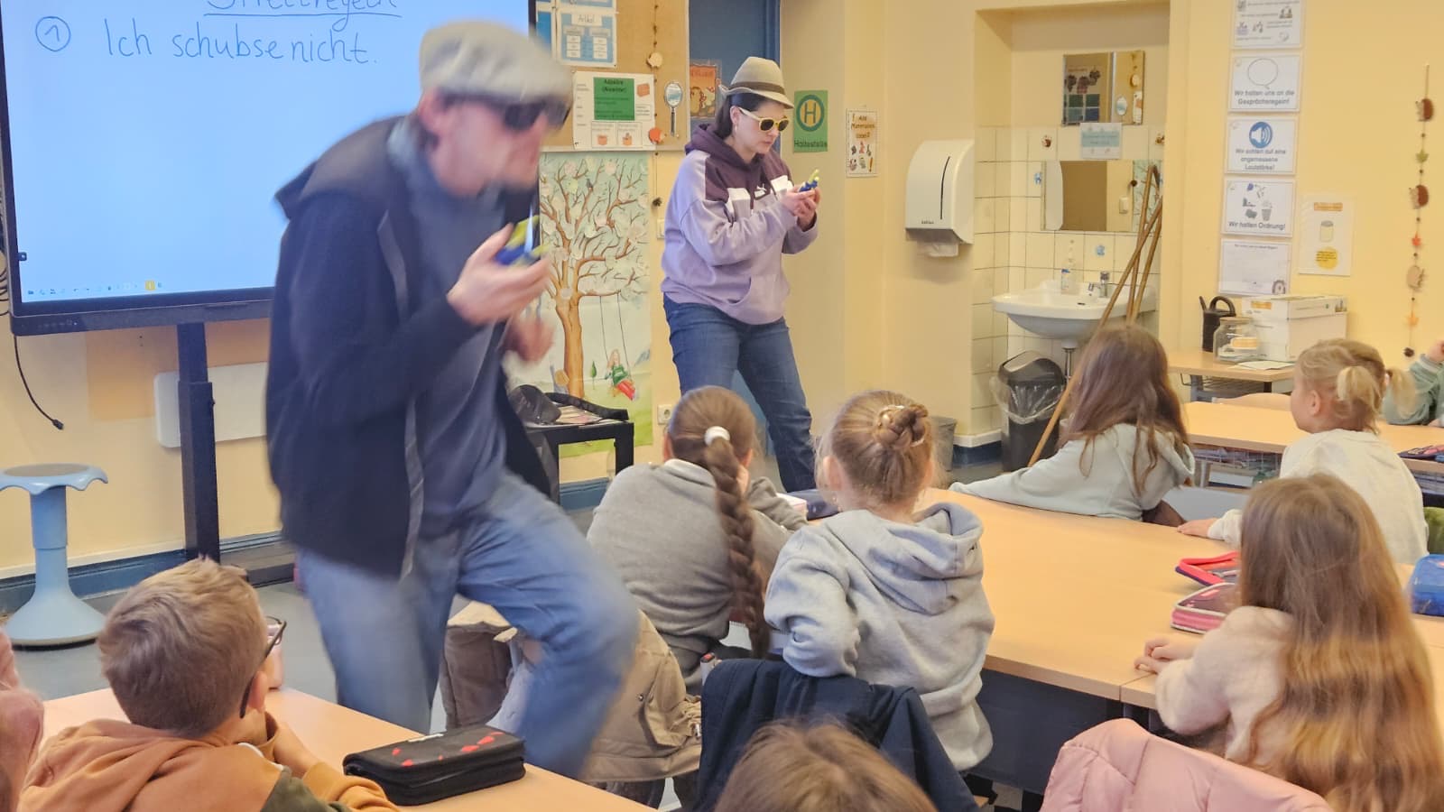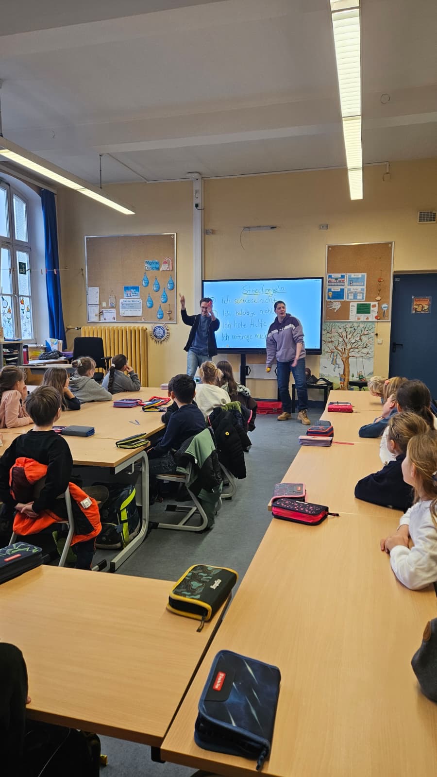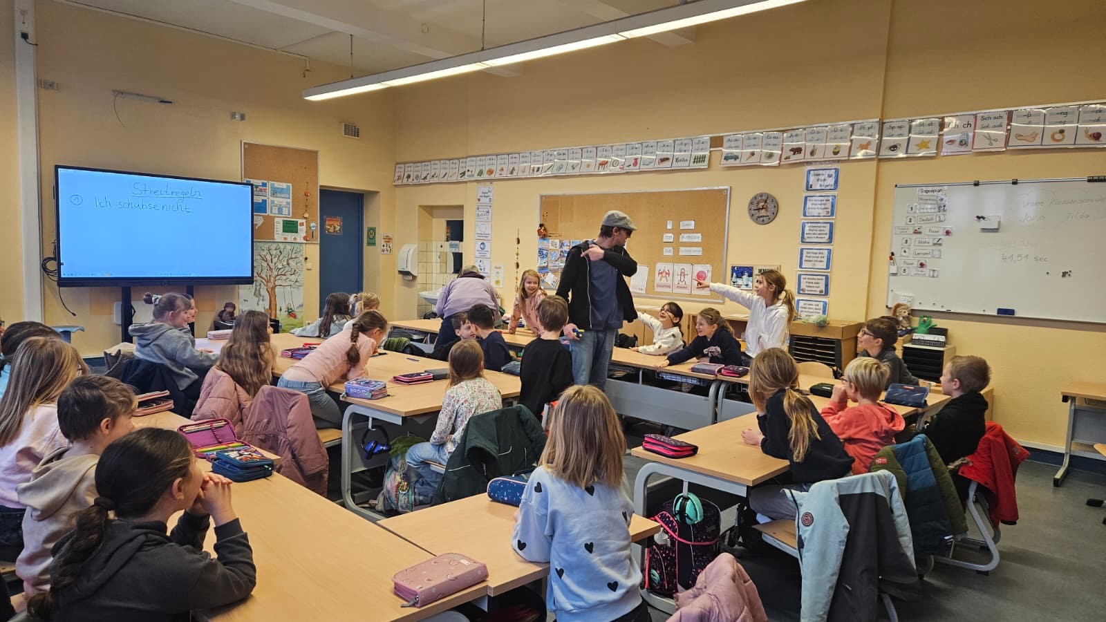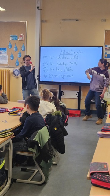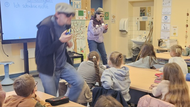 Am 27. Januar fand in der Igelklasse das Klassenzimmer-Theater „Cool bleiben – fair streiten“ vom CSE statt. Dabei fungieren die SchülerInnen als „StreitexpertInnen“ und helfen den beiden Darstellenden, Lösungsansätze für ihre verschiedenen Streitsituationen zu finden. Gemeinsam mit den SchülerInnen werden einheitliche Verhaltensregeln zum fairen und respektvollen Umgang miteinander erarbeitet, sowie Strategien zur gewaltfreien Lösung von Konflikten entwickelt.