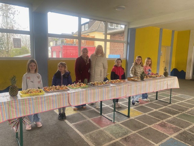 Am Freitag, den 20. März 2026 war die Igelklasse dran, das Josi-Frühstück für die ganze Schule auszurichten. Schon früh am Morgen wurde von den Kindern und einigen hilfsbereiten Eltern Obst gewaschen, geschnitten und aufgespießt. Es war so viel Obst da, dass einige Kinder sogar zwei oder drei Spieße essen konnten. Mmmh, es hat wieder sehr lecker geschmeckt!