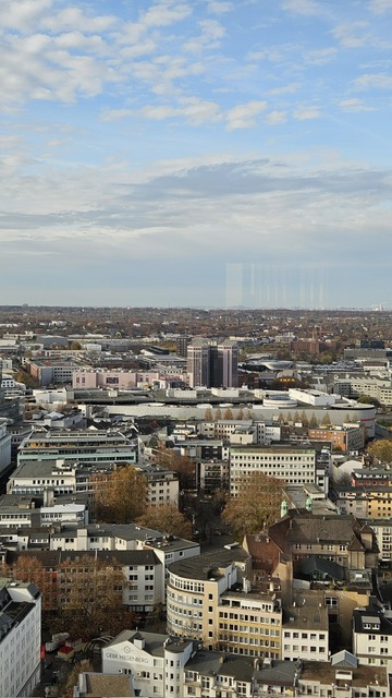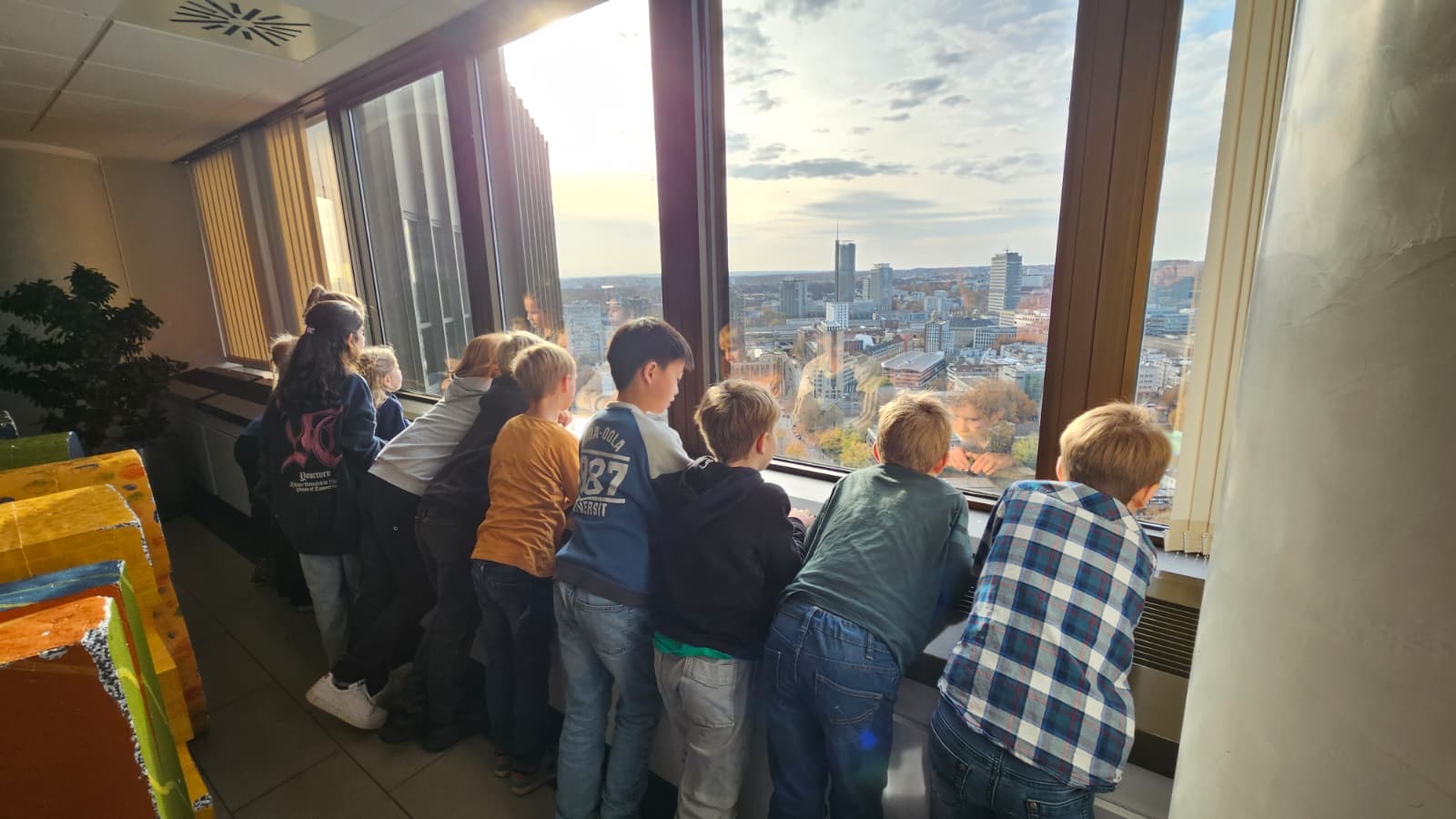Im Anschluss an unsere Sitzung durften wir dem Fahrstuhl in die 22. Etage fahren. Von dort aus konnten wir über ganz Essen schauen. In der Ferne konnte man sogar die Arena auf Schalke entdecken. Frau Klewin hat sich dann von verabschiedet und wir konnten endlich frühstücken.