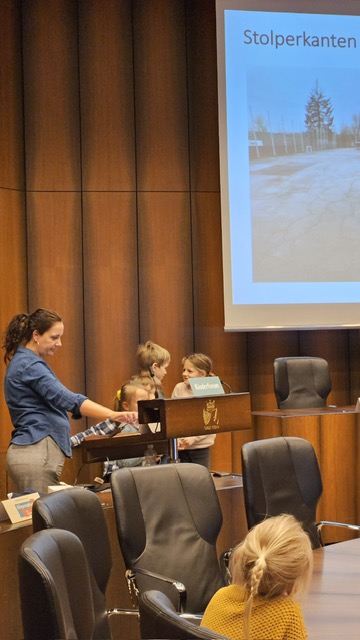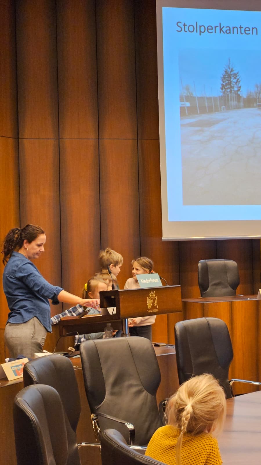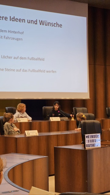Anschließend ging es in den großen Ratssaal zu unserer eigenen kleinen Ratssitzung. Dort wartete schon unsere Bürgermeisterin Frau Klewin auf uns. Wir durften in der ersten Reihe auf den großen Stühlen Platz nehmen, wo sonst die Mitglieder des Rates der Stadt der Essen sitzen. Eloise wurde zur Oberbürgermeisterin ernannt und durfte auf dem Platz von Herrn Kufen unsere Sitzung öffnen und leiten.