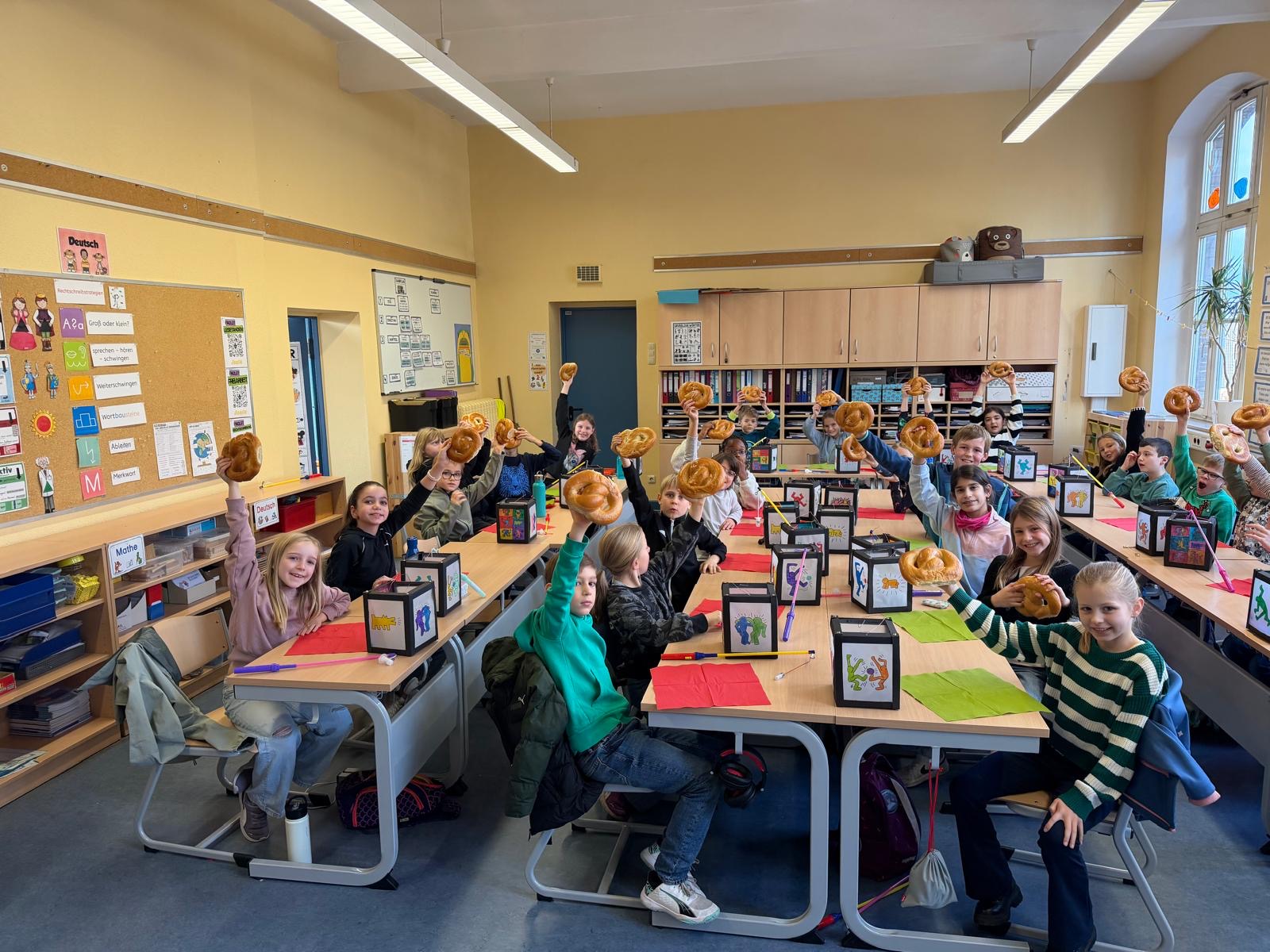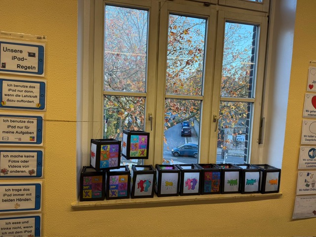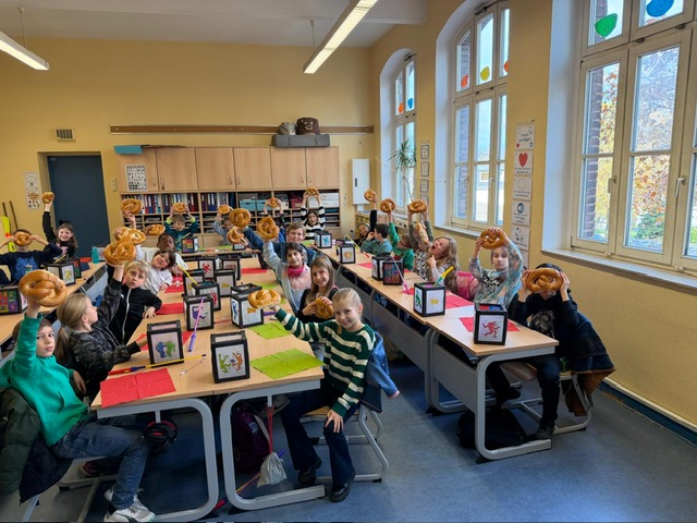 Die Bärenklasse bastelte in diesem Jahr Martinslaternen mit Keith-Haring-Motiven. Am Martinstag ließen sie sich einen Martinsbrezel schmecken.