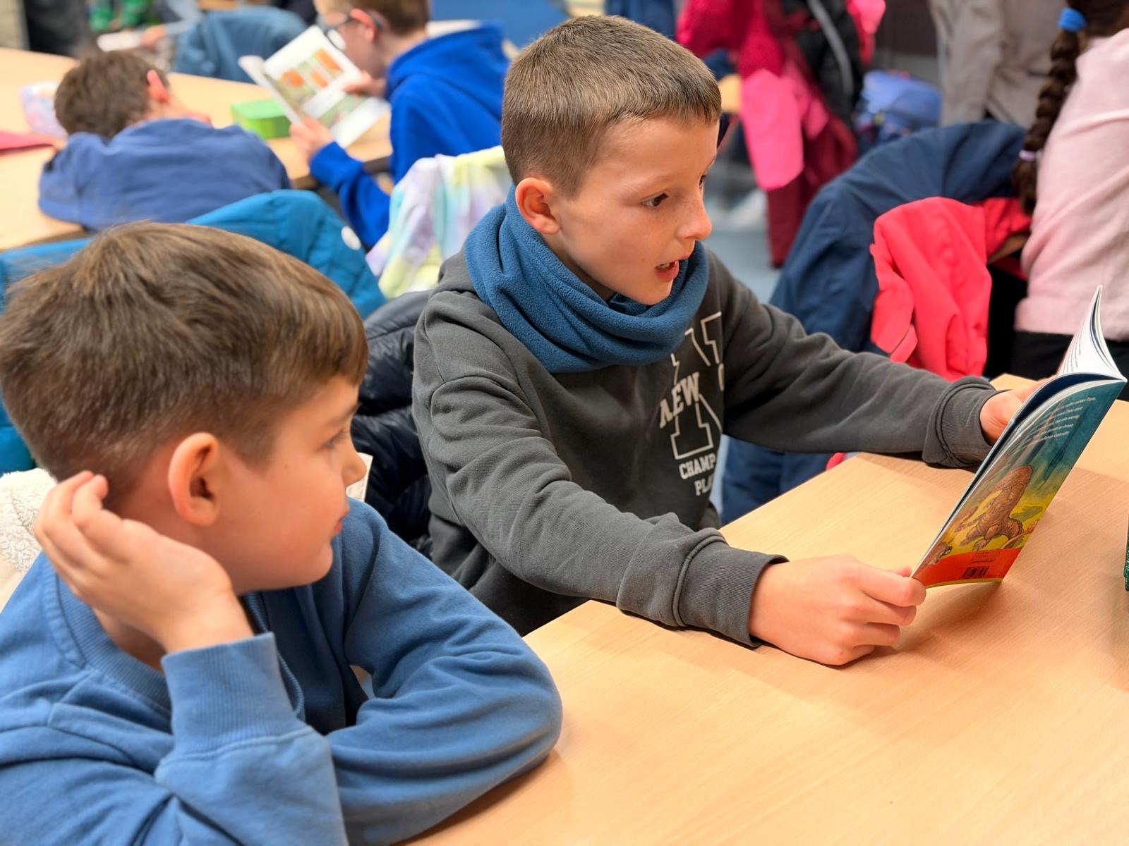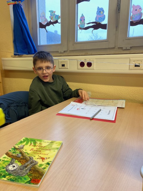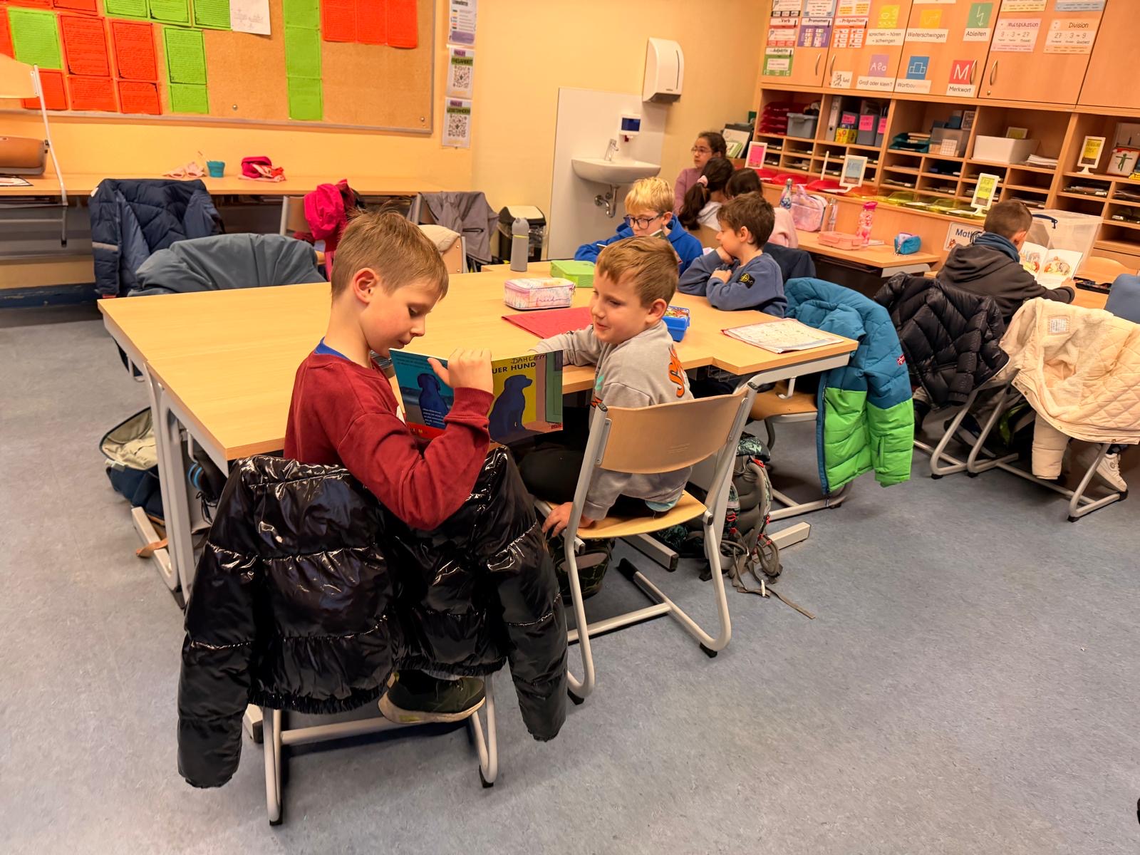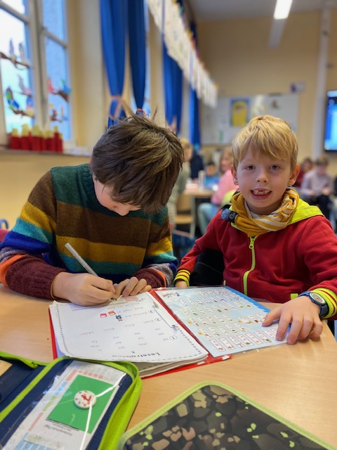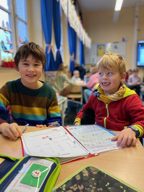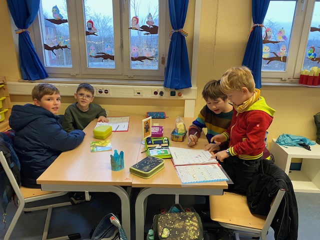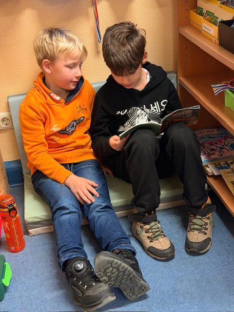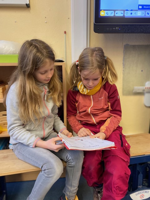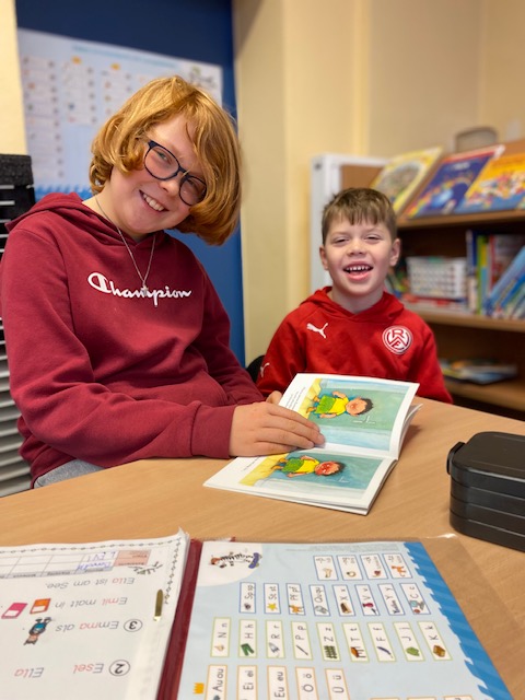 Am Dienstag fand in der Maulwurfklasse eine besondere Unterrichtsstunde statt. Die Kinder der Krokodilklasse trafen sich mit ihren Patenkindern zu einer Lesestunde. Nachdem sich jedes Team einen ruhigen Platz im Klassenraum der Maulwurf- oder Krokodilklasse gesucht hatte, begannen die Ersties den Großen ein paar Zeilen von ihrem Lese-Trainings-Zettel vorzulesen. Sehr geduldig hörten die Vierties ihren Paten zu und bestätigten anschließend mit ihrer Unterschrift auf dem Lesezettel das erfolgreiche Lesetraining. Nun wurden die Rollen getauscht: Die Großen wählten gemeinsam mit ihren Patenkindern ein Buch aus Frau Dahlems Lesekiste und machten es sich zum Vorlesen gemütlich. Leider ging die Zeit viel zu schnell vorbei. Als der Pausen-Gong ertönte, durften die Kinder noch zusammen frühstücken. Die kleinen Maulwürfe freuen sich schon auf die nächste Lesezeit mit den Krokodilen.