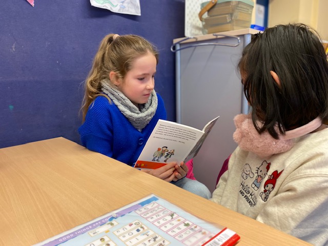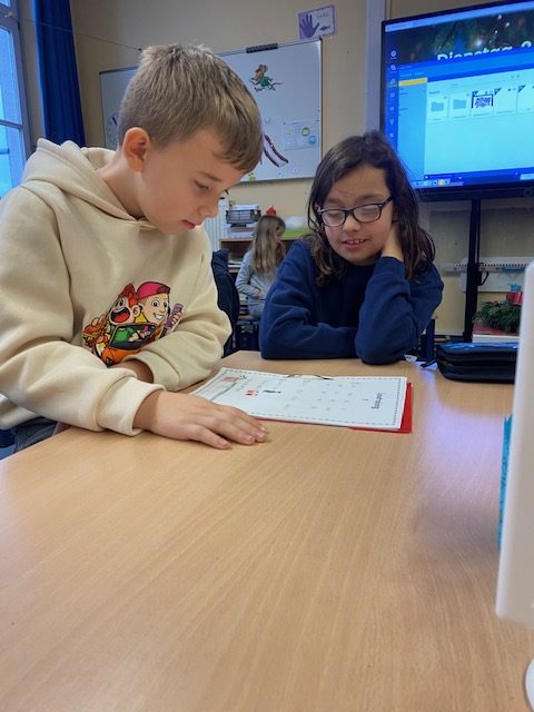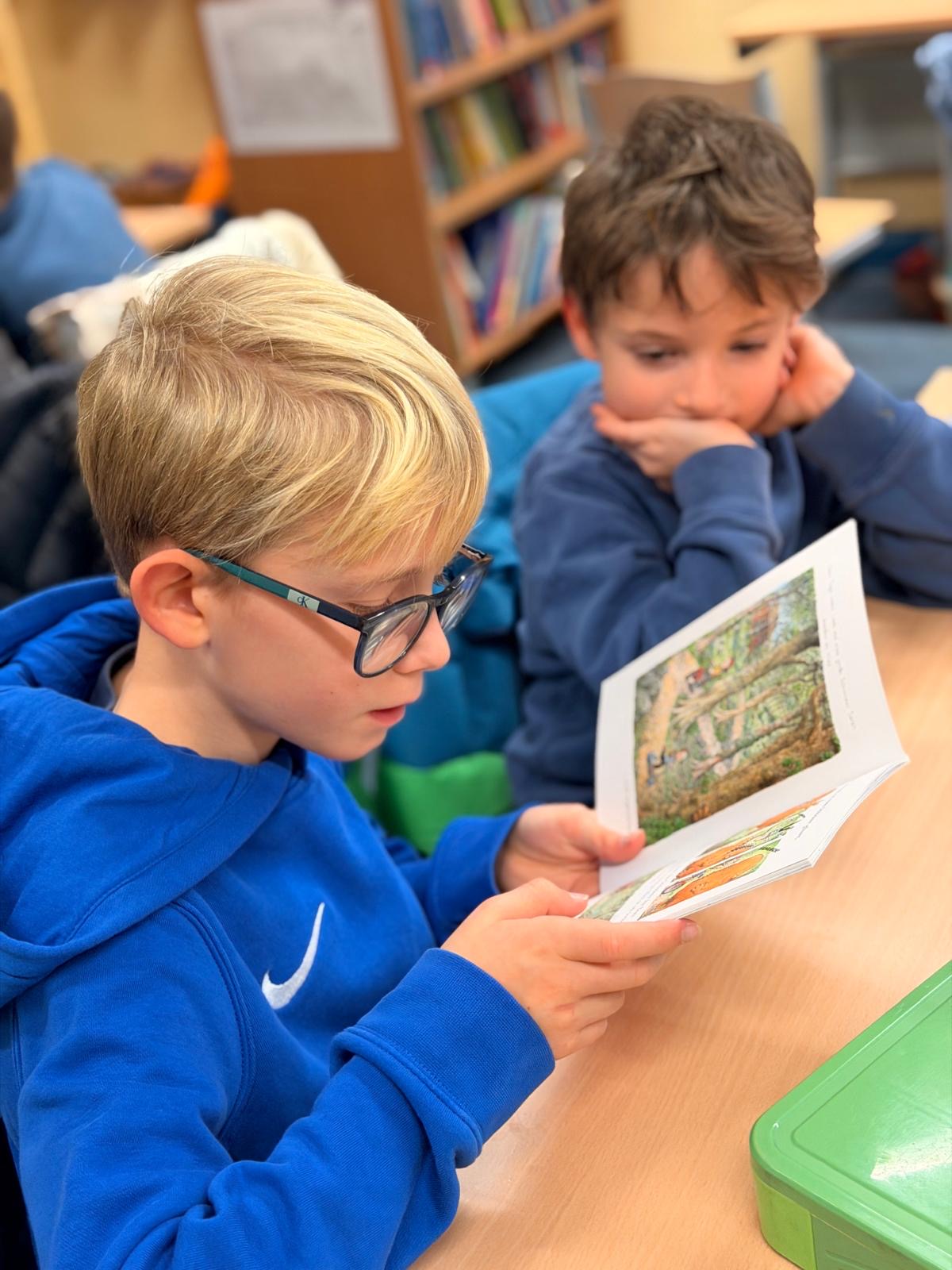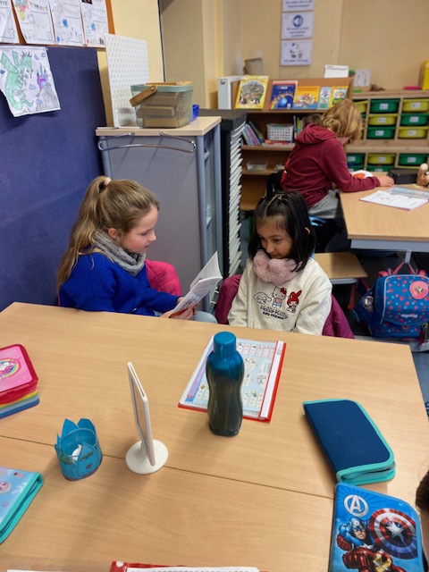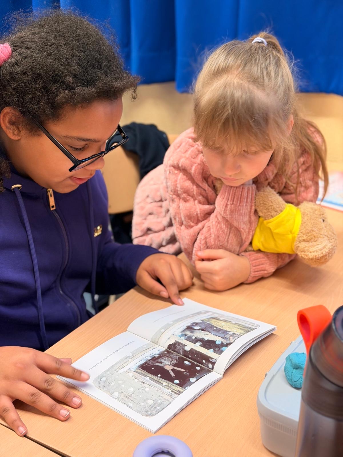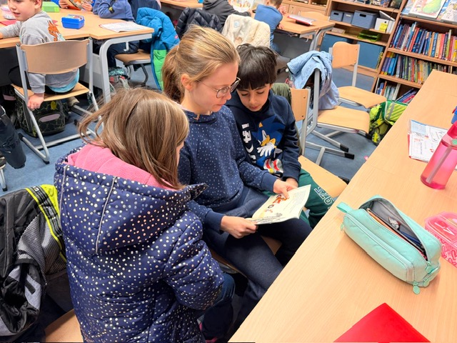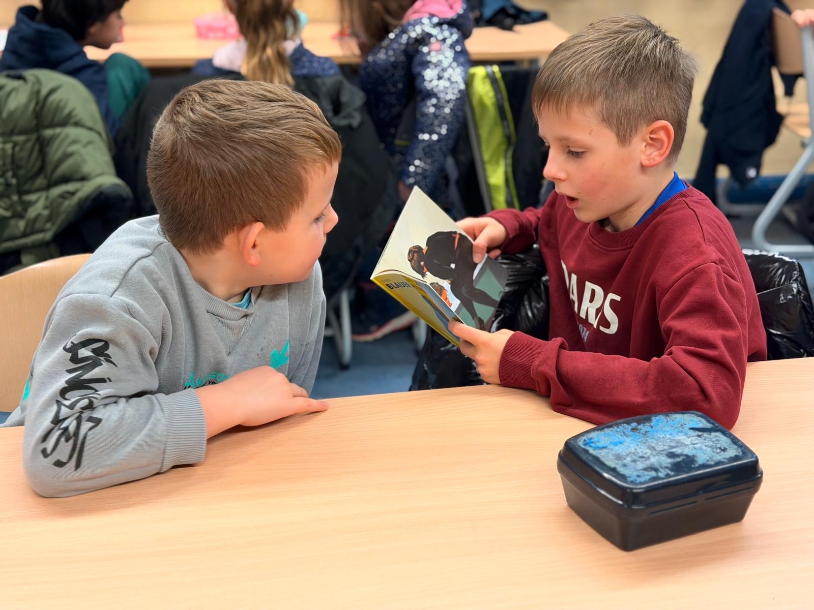Am Dienstag fand in der Maulwurfklasse eine besondere Unterrichtsstunde statt. Die Kinder der Krokodilklasse trafen sich mit ihren Patenkindern zu einer Lesestunde. Nachdem sich jedes Team einen ruhigen Platz im Klassenraum der Maulwurf- oder Krokodilklasse gesucht hatte, begannen die Ersties den Großen ein paar Zeilen von ihrem Lese-Trainings-Zettel vorzulesen. Sehr geduldig hörten die Vierties ihren Paten zu und bestätigten anschließend mit ihrer Unterschrift auf dem Lesezettel das erfolgreiche Lesetraining. Nun wurden die Rollen getauscht: Die Großen wählten gemeinsam mit ihren Patenkindern ein Buch aus Frau Dahlems Lesekiste und machten es sich zum Vorlesen gemütlich. Leider ging die Zeit viel zu schnell vorbei. Als der Pausen-Gong ertönte, durften die Kinder noch zusammen frühstücken. Die kleinen Maulwürfe freuen sich schon auf die nächste Lesezeit mit den Krokodilen.