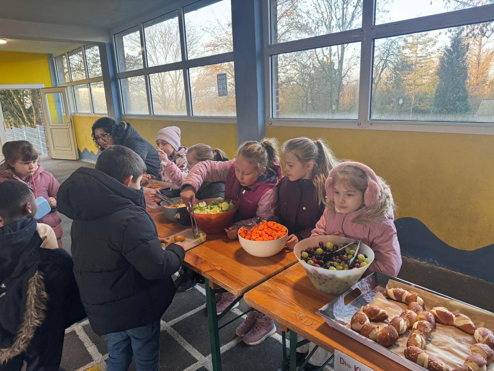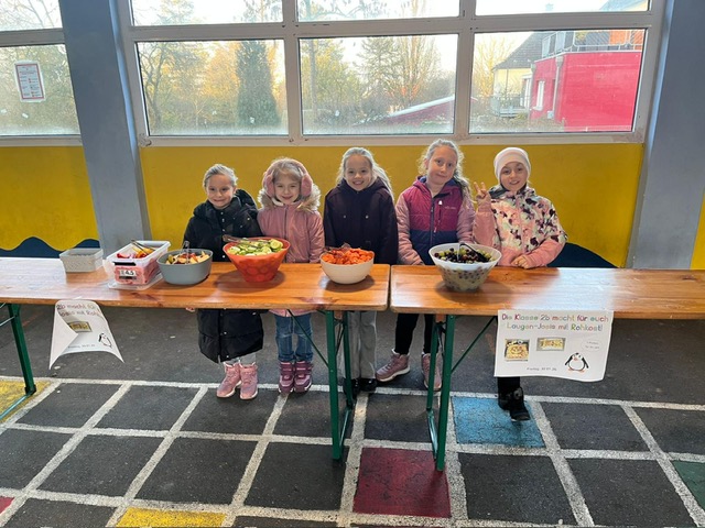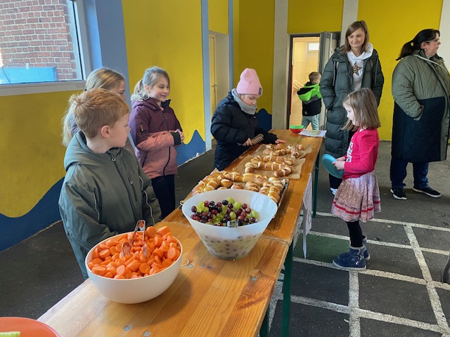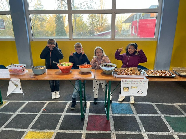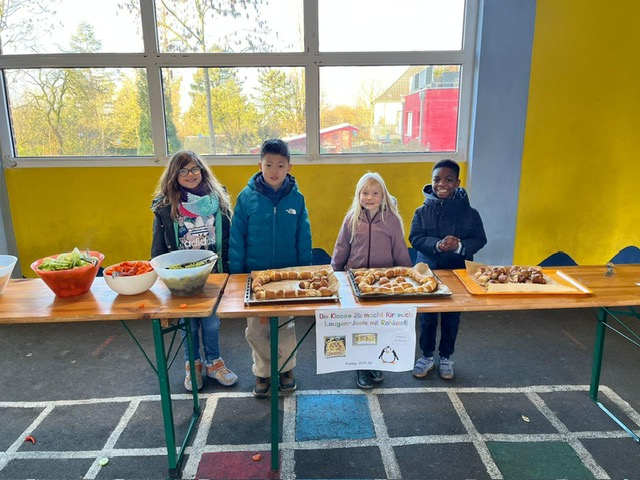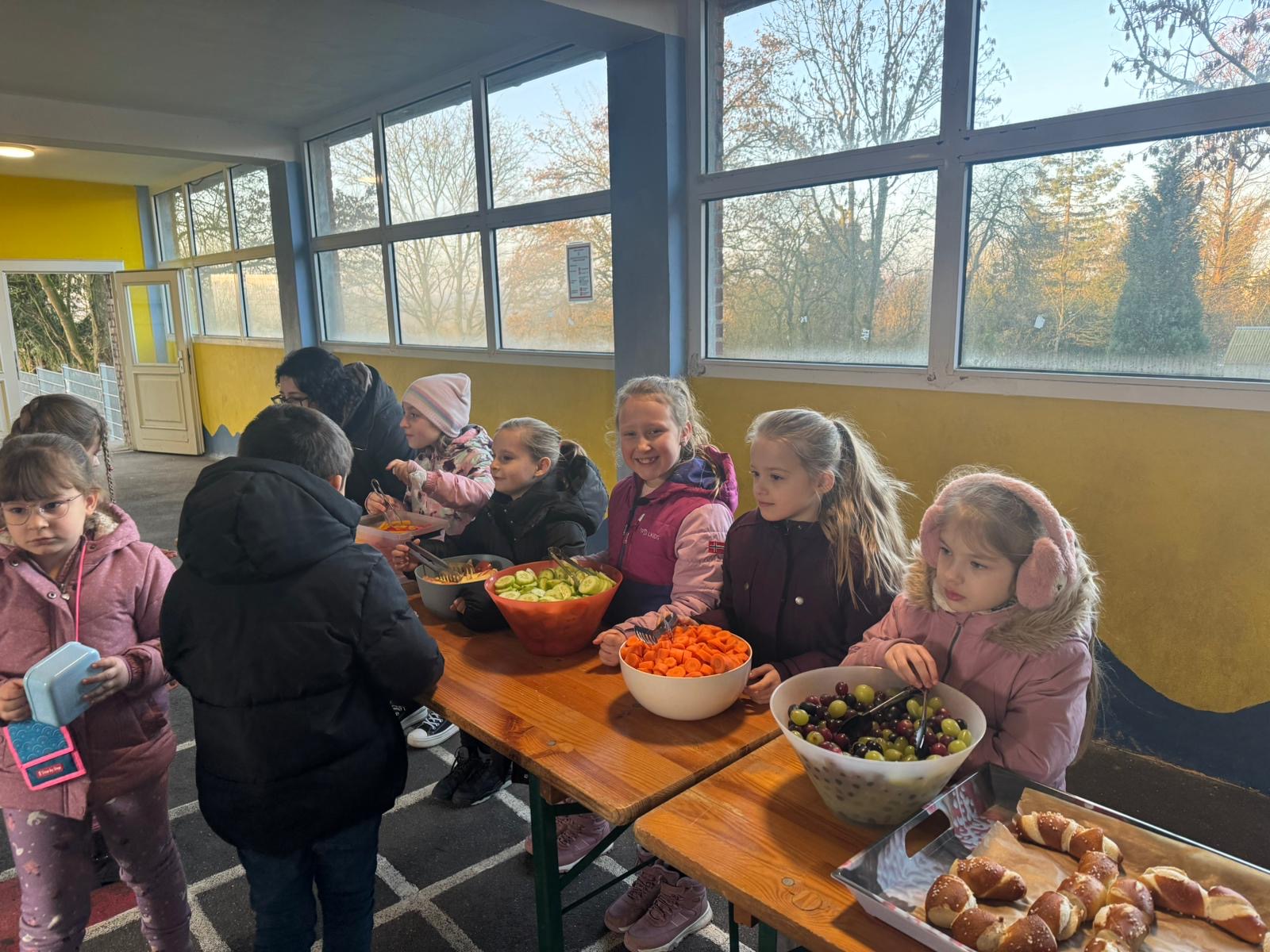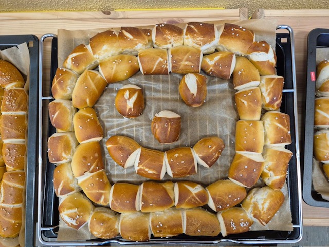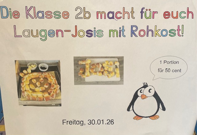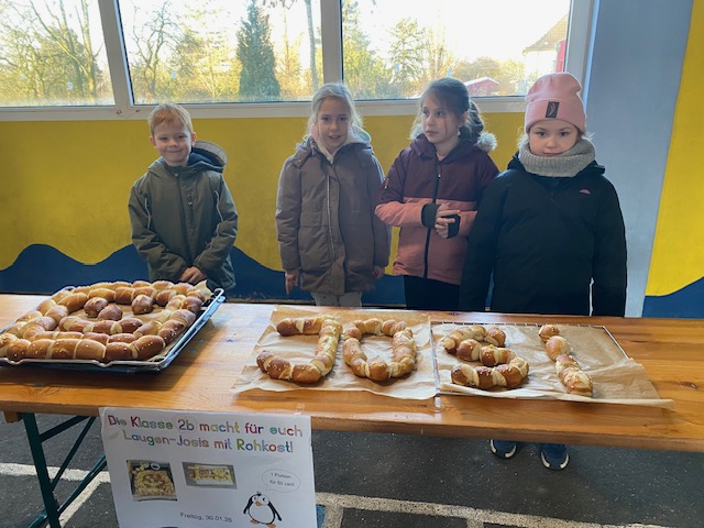 Am Freitag, den 30. Januar richtete die Pinguin-Klasse das Josi-Frühstück aus und überraschte ihre Mitschüler und Mitschülerinnen mit selbstgebackenen Josi-Laugenbrötchen. Die Brötchen kamen frisch aus dem Ofen und waren auf den Backblechen wir große Josi-Gesichter angerichtet. Auch der Schriftzug „JOSI“ wurde im Ofen gebacken. ZUm Brötchen durften die Kinder sich an geschnittenem Obst und Rohkost bedienen. Mmmh… sehr lecker!