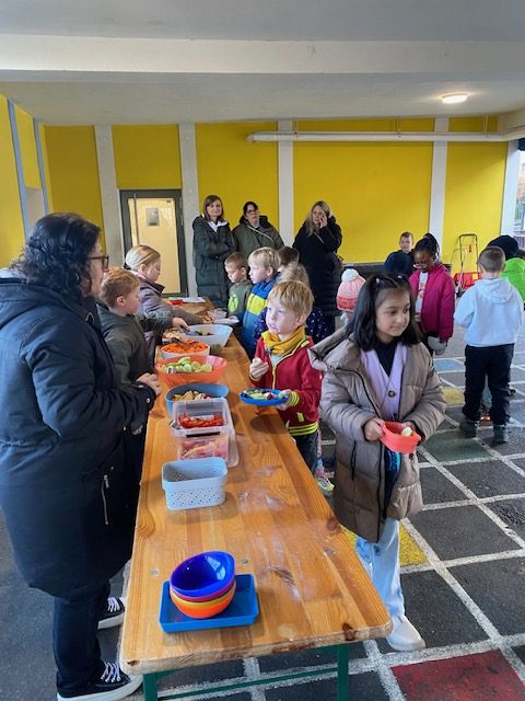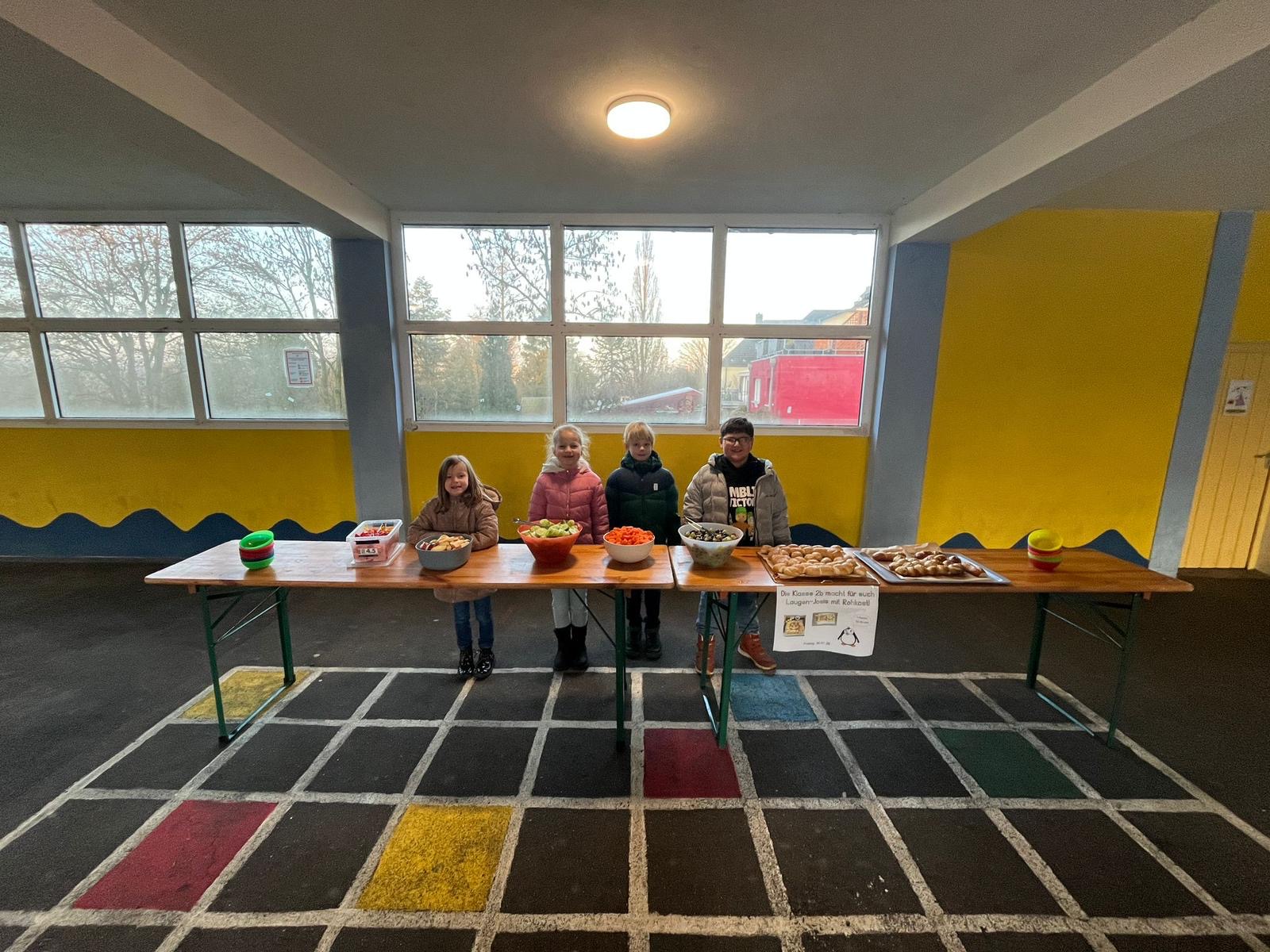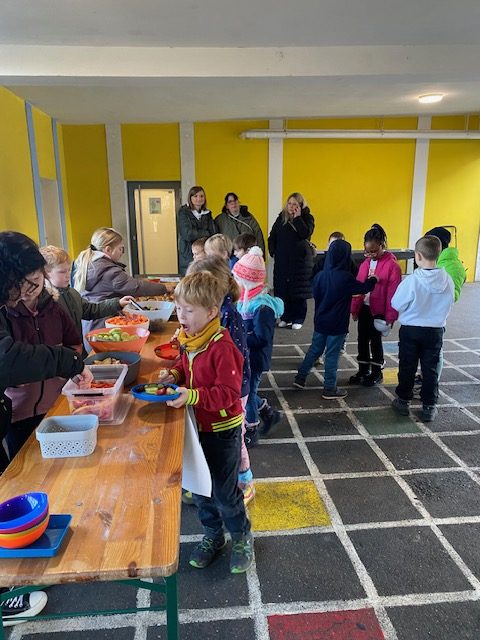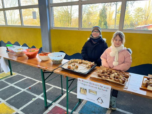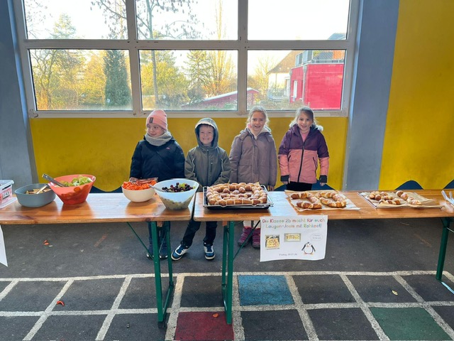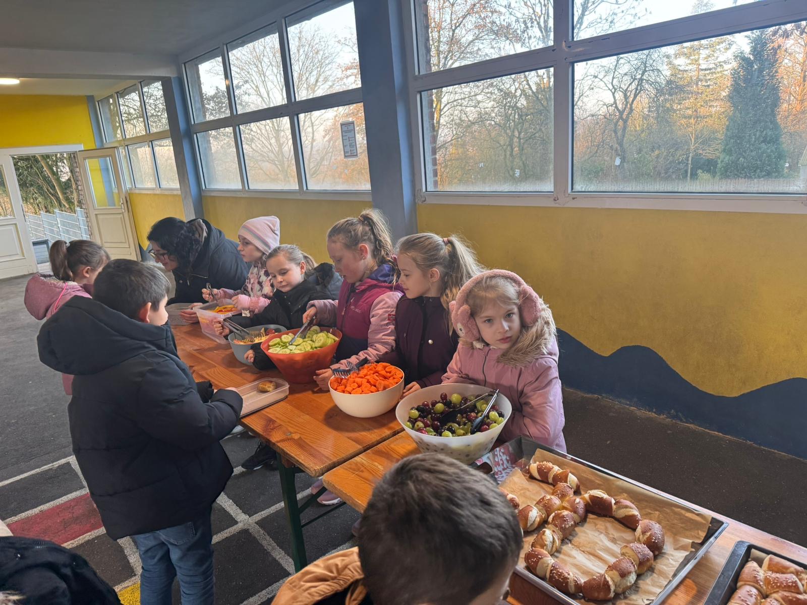Am Freitag, den 30. Januar richtete die Pinguin-Klasse das Josi-Frühstück aus und überraschte ihre Mitschüler und Mitschülerinnen mit selbstgebackenen Josi-Laugenbrötchen. Die Brötchen kamen frisch aus dem Ofen und waren auf den Backblechen wir große Josi-Gesichter angerichtet. Auch der Schriftzug „JOSI“ wurde im Ofen gebacken. ZUm Brötchen durften die Kinder sich an geschnittenem Obst und Rohkost bedienen. Mmmh… sehr lecker!