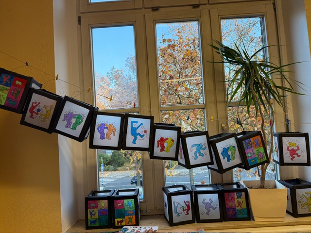 Die Bärenklasse bastelte in diesem Jahr Martinslaternen mit Keith-Haring-Motiven. Am Martinstag ließen sie sich einen Martinsbrezel schmecken.