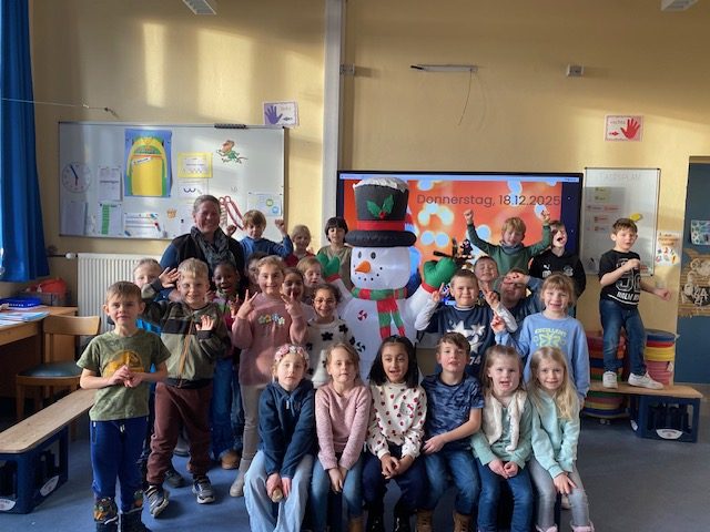Heute stand ungewöhnlicher Besuch vor der Tür. Zuerst war es nur ein Sack mit Stoff und einem Kabel. Doch ein Schüler der Klasse wusste was zu tun war. Kabel in die Steckdose stecken! Und schon verwandelte sich der Stoffballen in einen leuchtenden Schneemann. Was für eine schöne Überraschung für die Maulwurfklasse am vorletzten Schulatg!